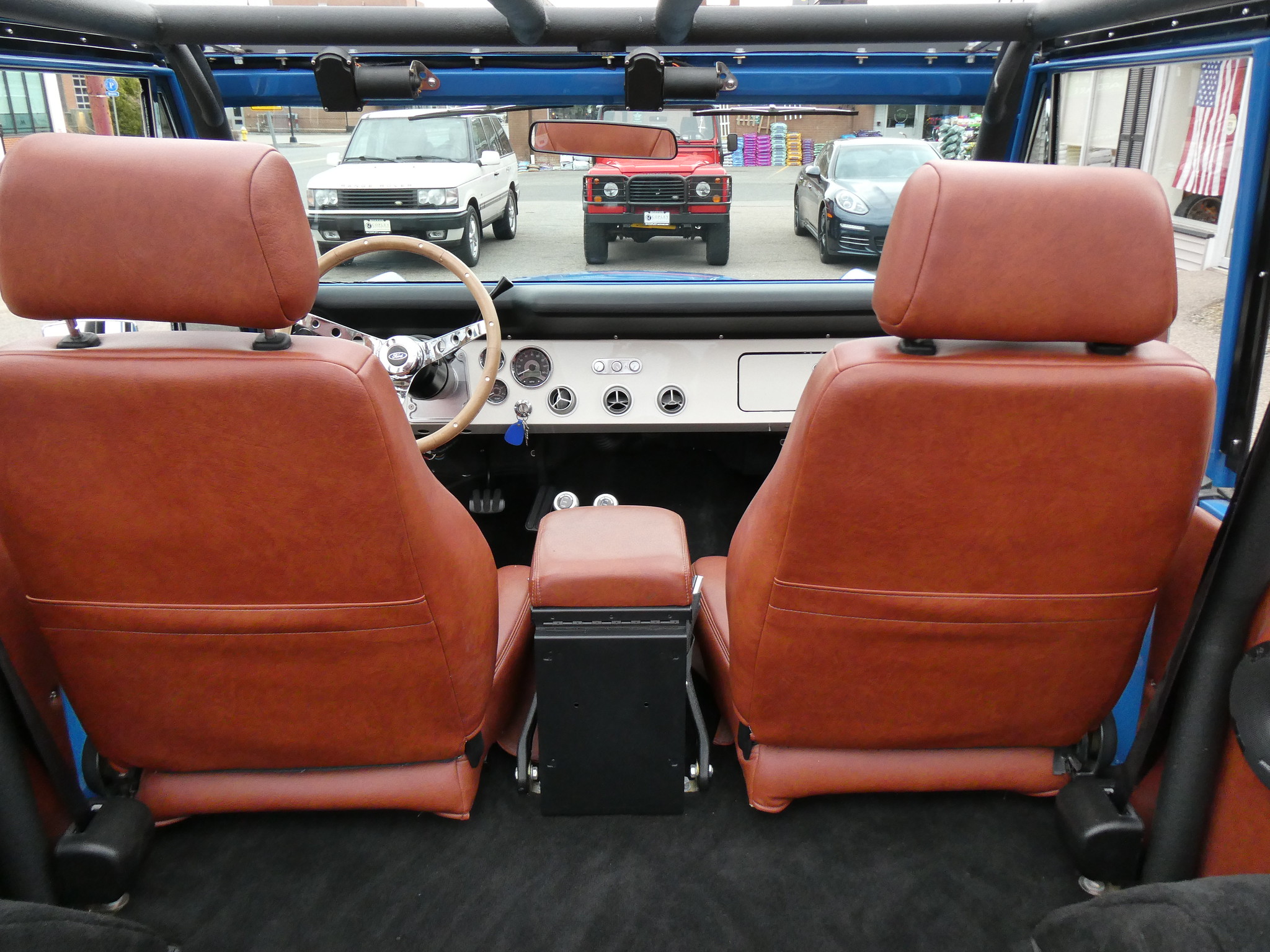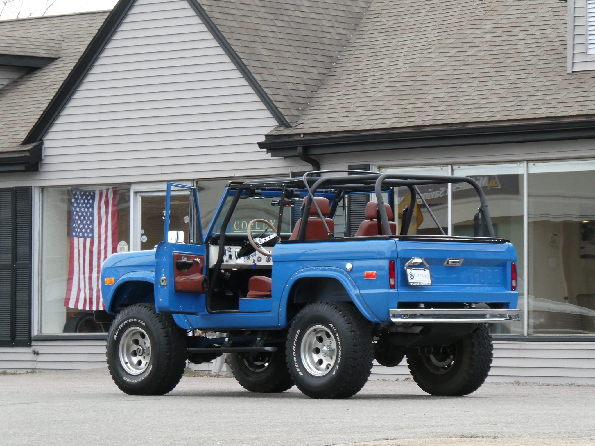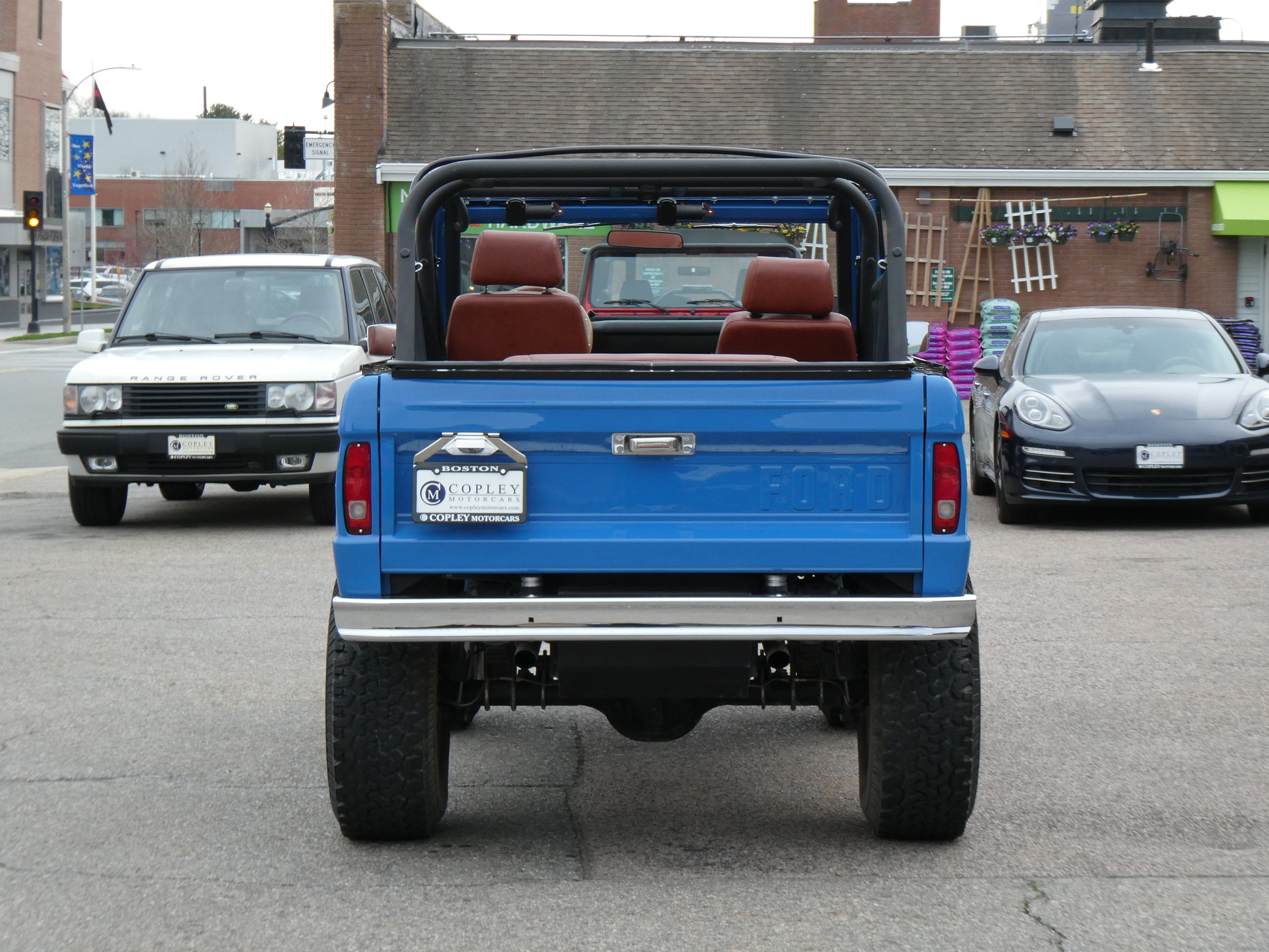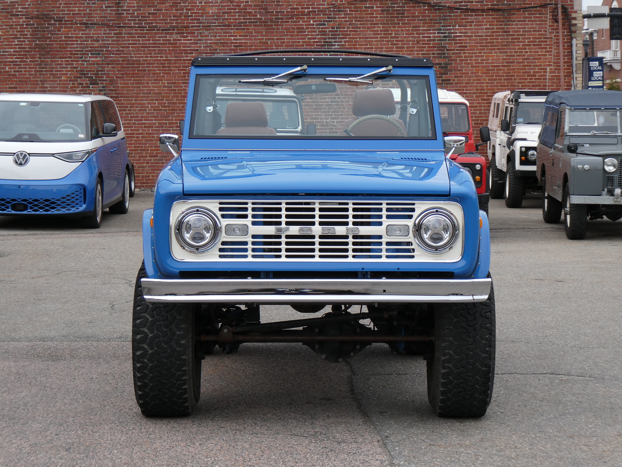 1977 Ford Bronco by Custom Ford Bronco, Bahama Blue with ball glove leather, 5.0 litre Ford Coyote engine making 395hp with 400lb-ft of torque, Ford 4 speed automatic transmission, four wheel drive with high-low range, power steering, Wildwood power disc brakes, forward facing rear bench seat for two with 3-point seat belts, full removable soft top, automatic electric side steps, TuffyBox center cubby, Pioneer hi-fi sound system, integrated roll cage, a first generation Bronco restored a handful of years ago by Bronco specialist Custom Ford Bronco, and just coming to us after several years of family fun at the beach.
