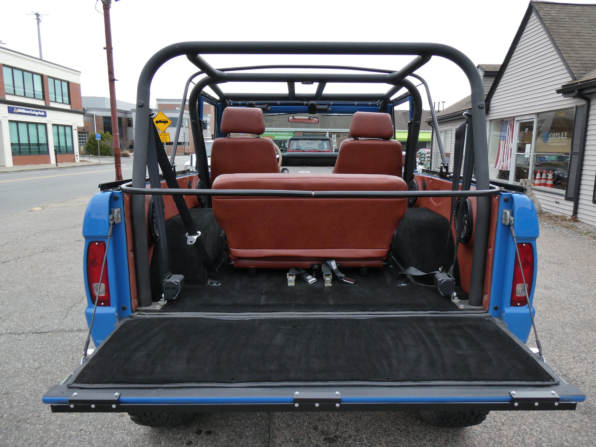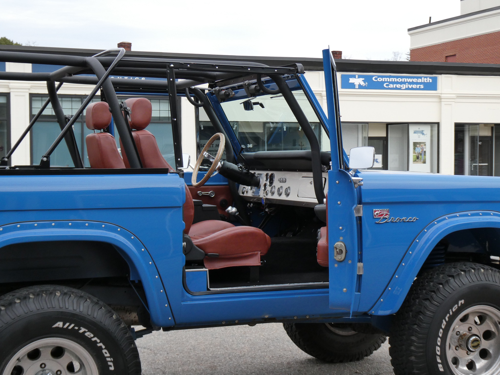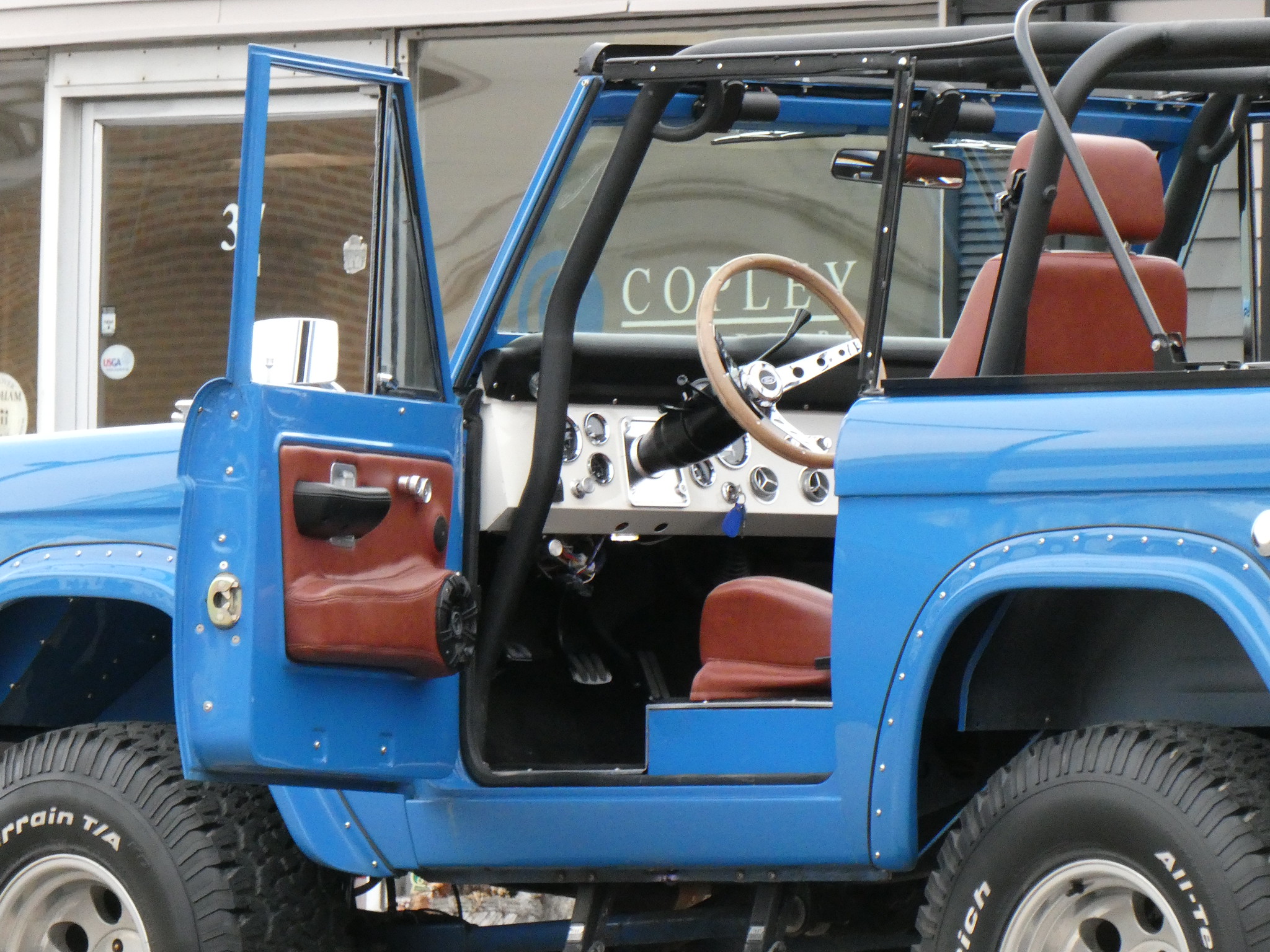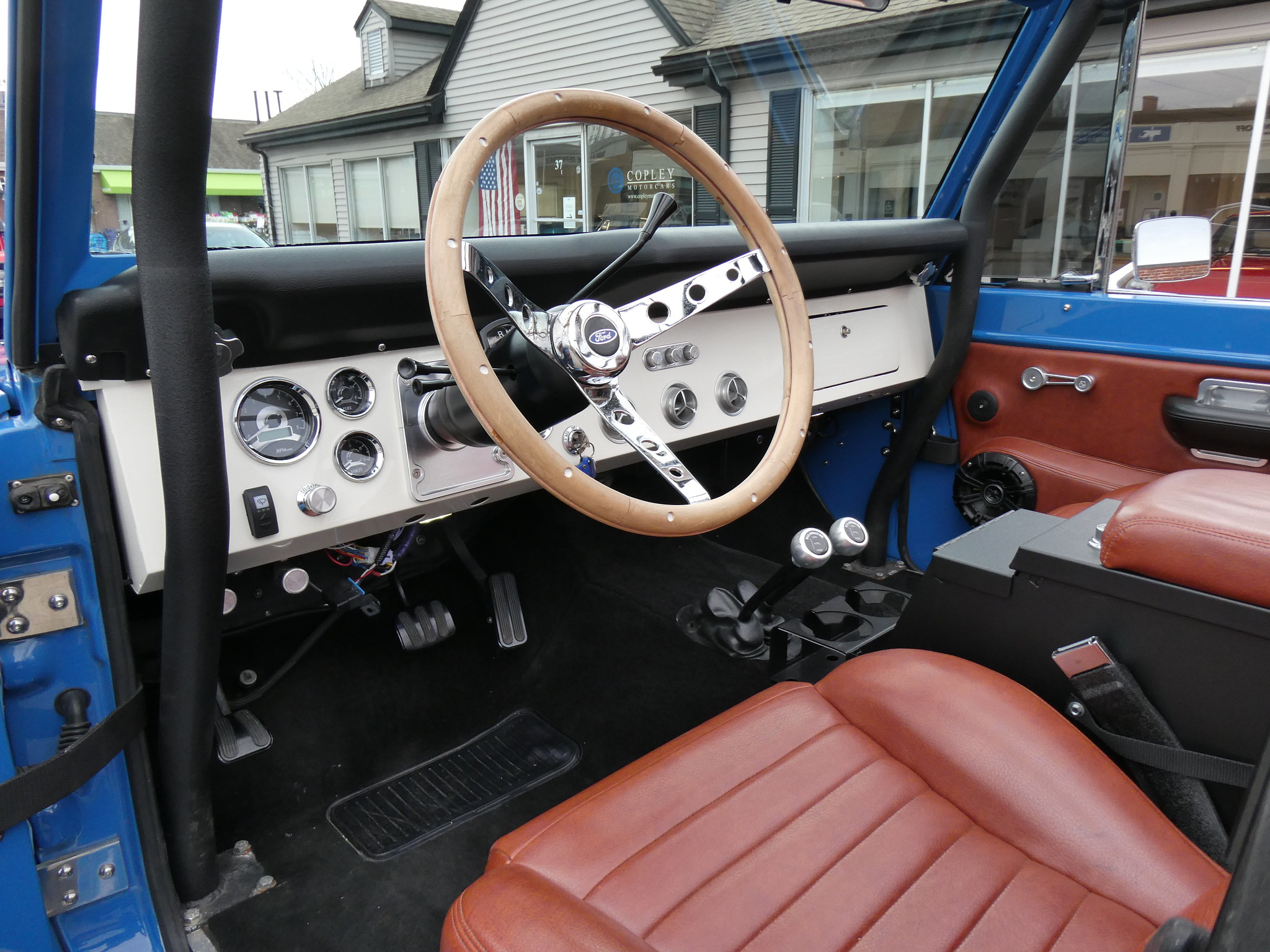 1977 Ford Bronco by Custom Ford Bronco, Bahama Blue with ball glove leather, 5.0 litre Ford Coyote engine making 395hp with 400lb-ft of torque, Ford 4 speed automatic transmission, four wheel drive with high-low range, power steering, Wildwood power disc brakes, forward facing rear bench seat for two with 3-point seat belts, full removable soft top, automatic electric side steps, TuffyBox center cubby, Pioneer hi-fi sound system, integrated roll cage, a first generation Bronco restored a handful of years ago by Bronco specialist Custom Ford Bronco, and just coming to us after several years of family fun at the beach.