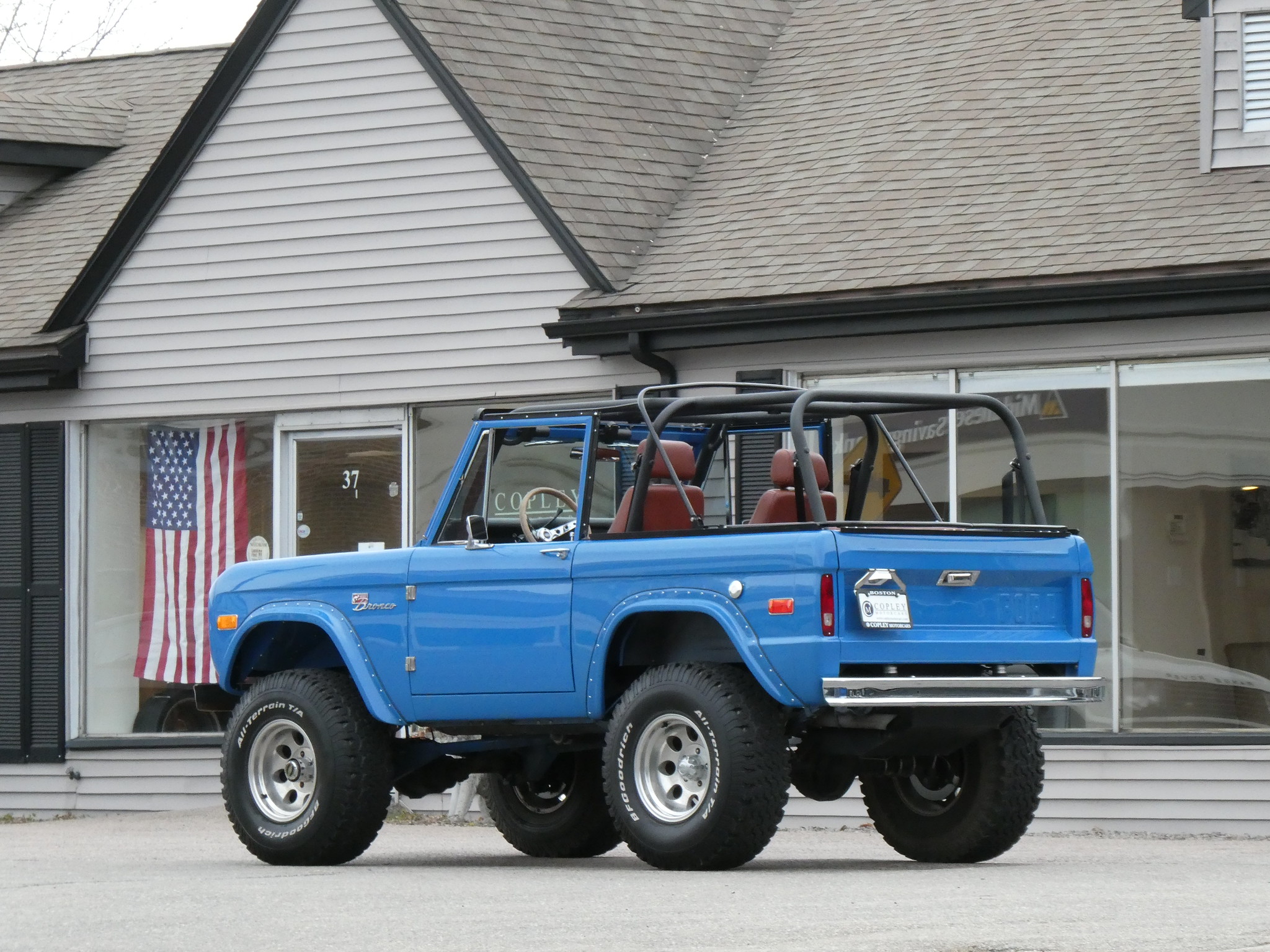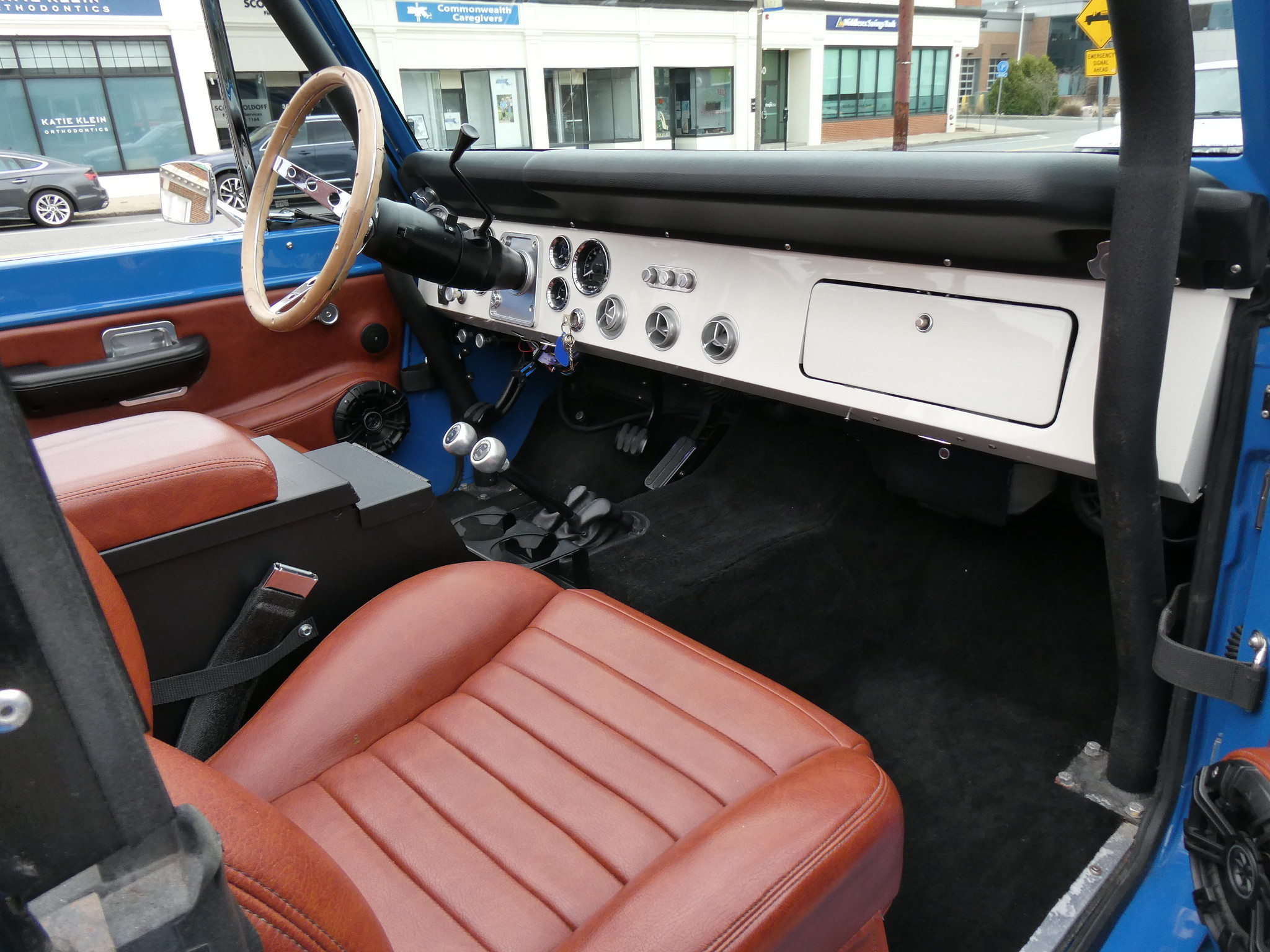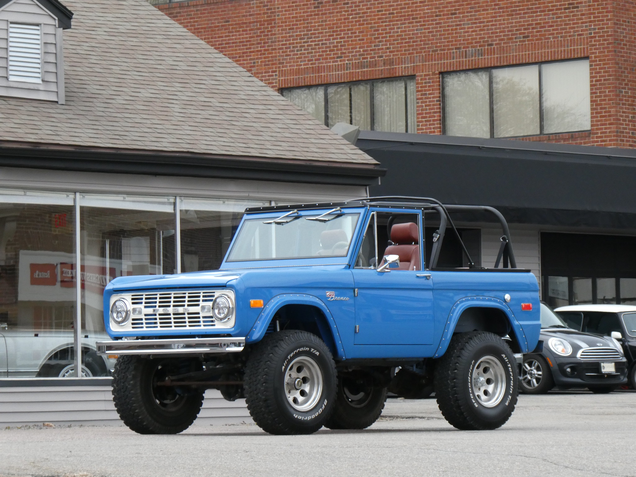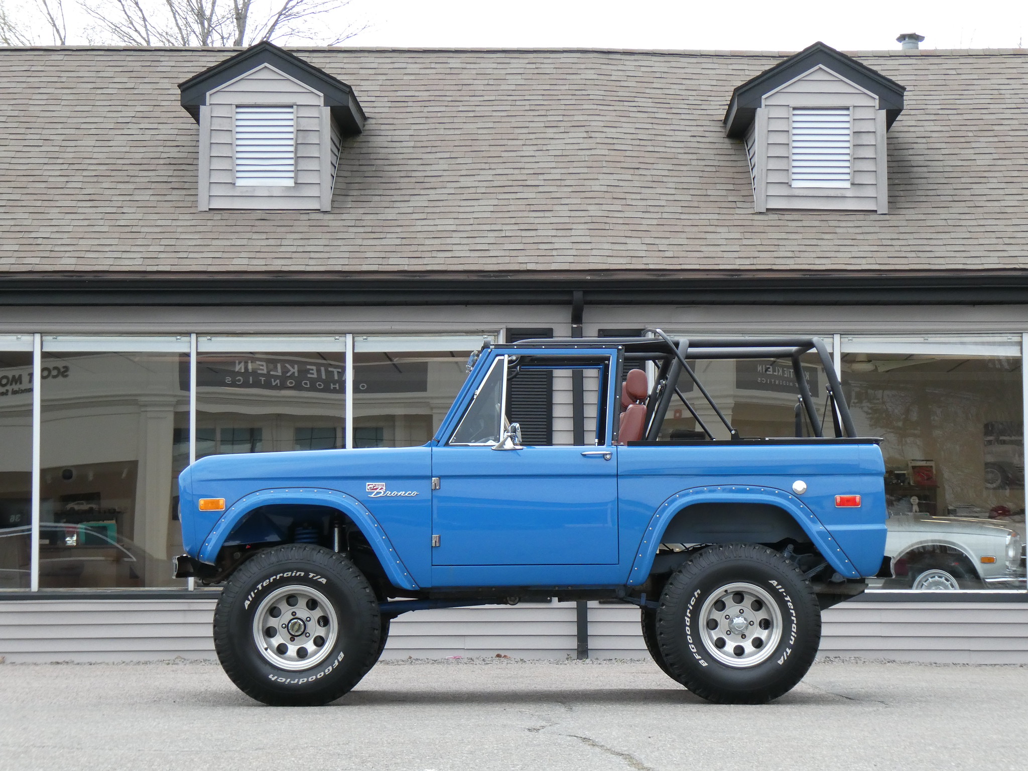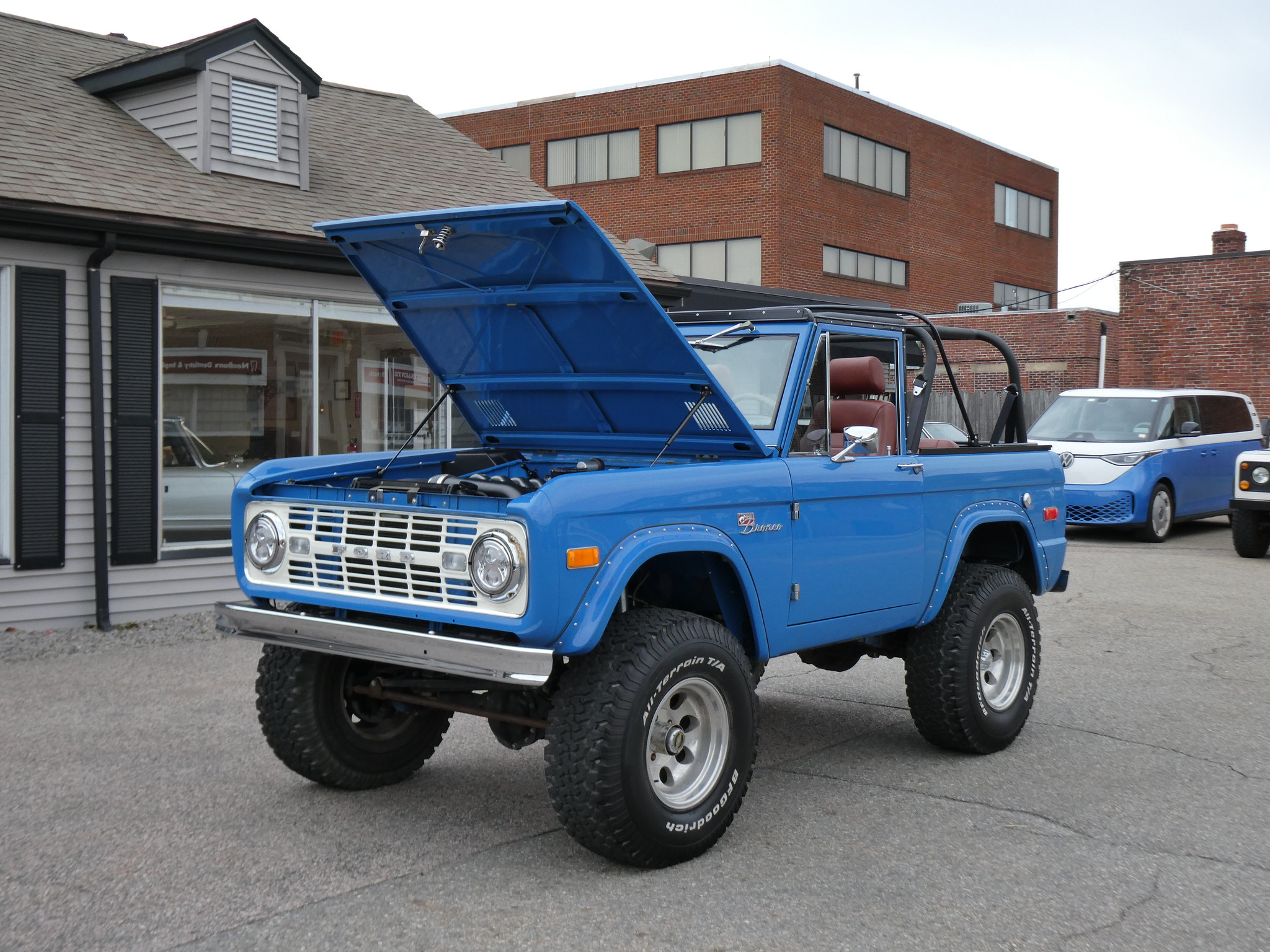 1977 Ford Bronco by Custom Ford Bronco, Bahama Blue with ball glove leather, 5.0 litre Ford Coyote engine making 395hp with 400lb-ft of torque, Ford 4 speed automatic transmission, four wheel drive with high-low range, power steering, Wildwood power disc brakes, forward facing rear bench seat for two with 3-point seat belts, full removable soft top, automatic electric side steps, TuffyBox center cubby, Pioneer hi-fi sound system, integrated roll cage, a first generation Bronco restored a handful of years ago by Bronco specialist Custom Ford Bronco, and just coming to us after several years of family fun at the beach.