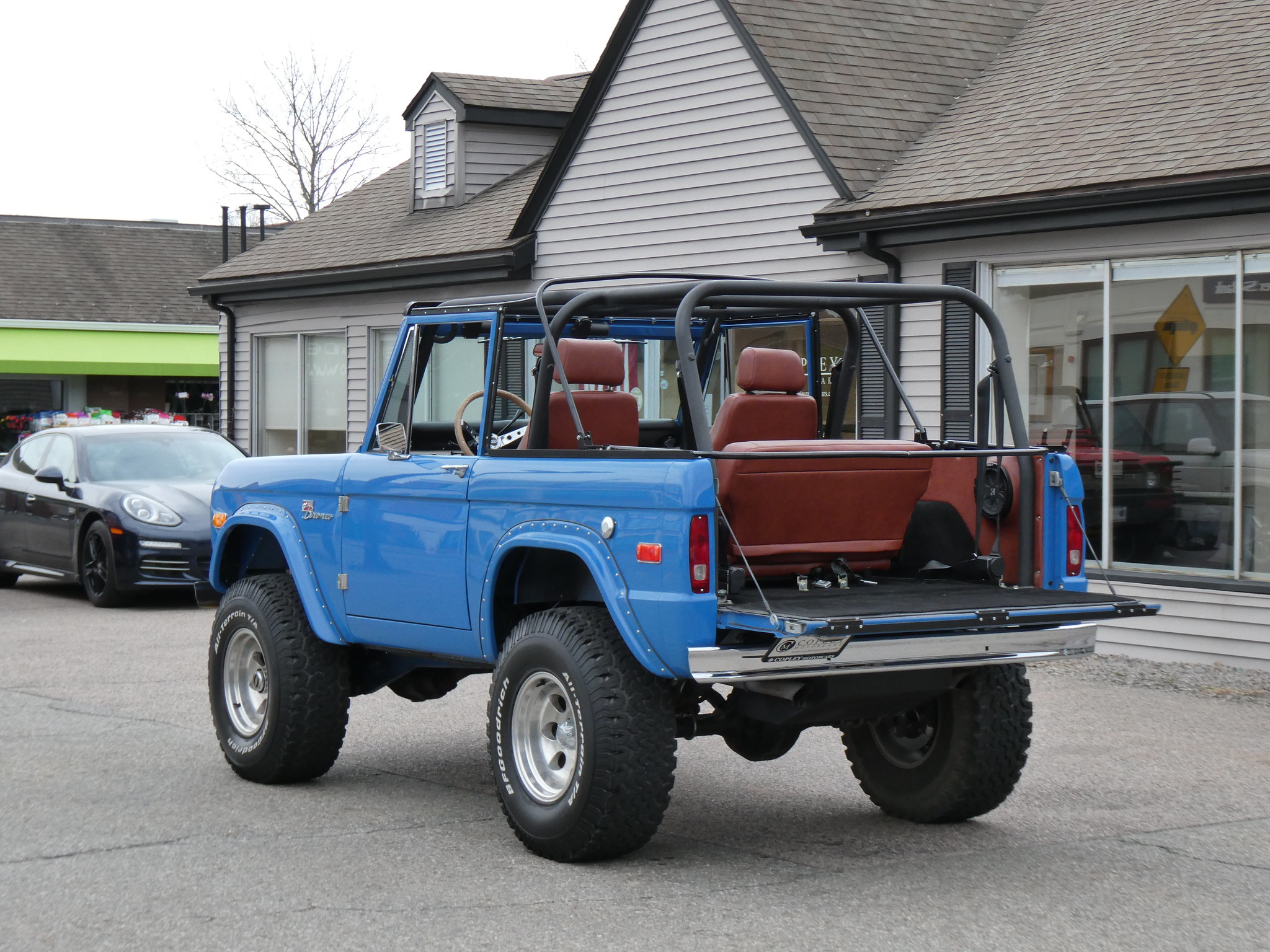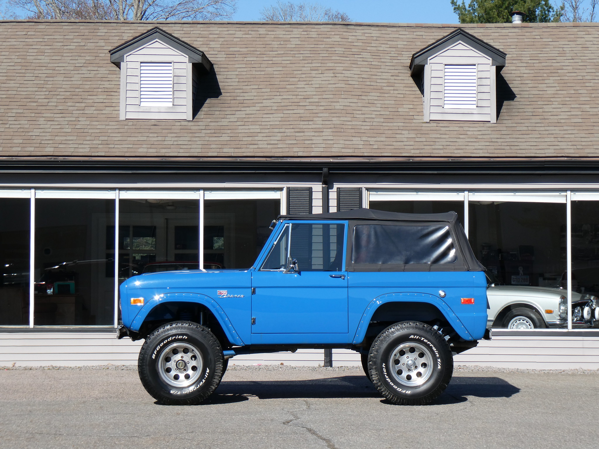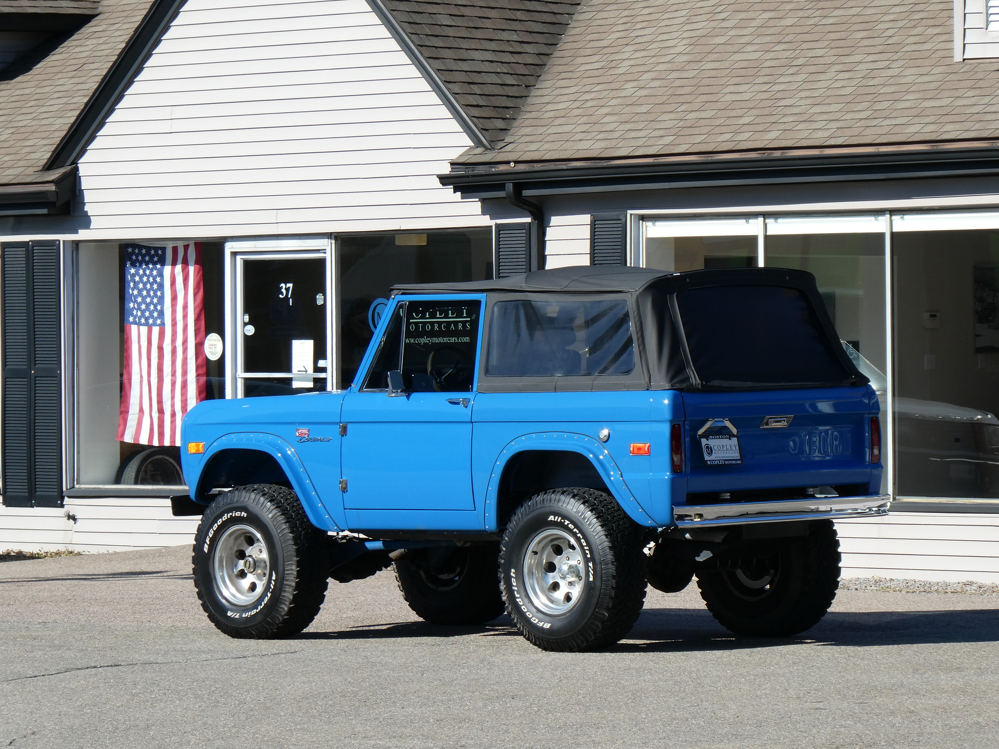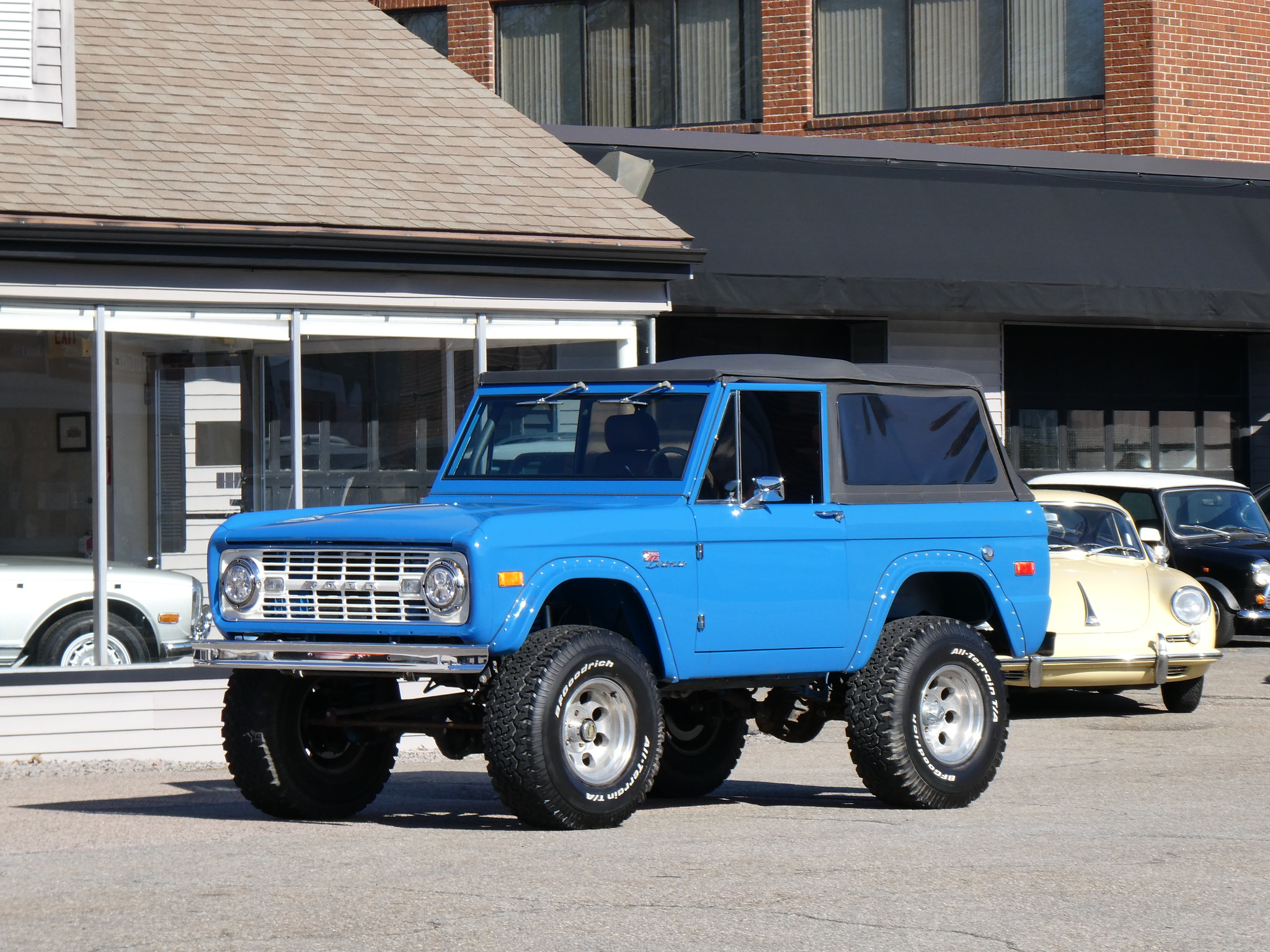 1977 Ford Bronco by Custom Ford Bronco, Bahama Blue with ball glove leather, 5.0 litre Ford Coyote engine making 395hp with 400lb-ft of torque, Ford 4 speed automatic transmission, four wheel drive with high-low range, power steering, Wildwood power disc brakes, forward facing rear bench seat for two with 3-point seat belts, full removable soft top, automatic electric side steps, TuffyBox center cubby, Pioneer hi-fi sound system, integrated roll cage, a first generation Bronco restored a handful of years ago by Bronco specialist Custom Ford Bronco, and just coming to us after several years of family fun at the beach.