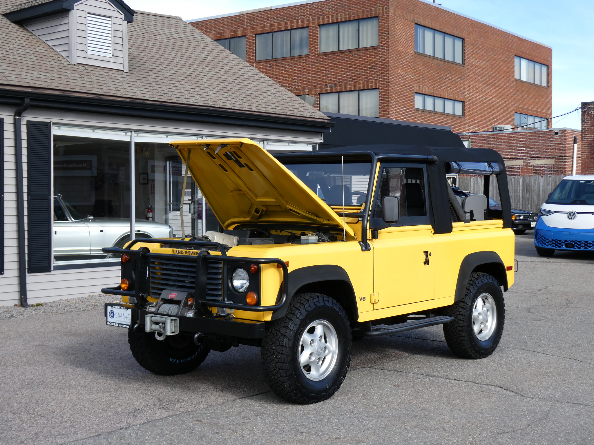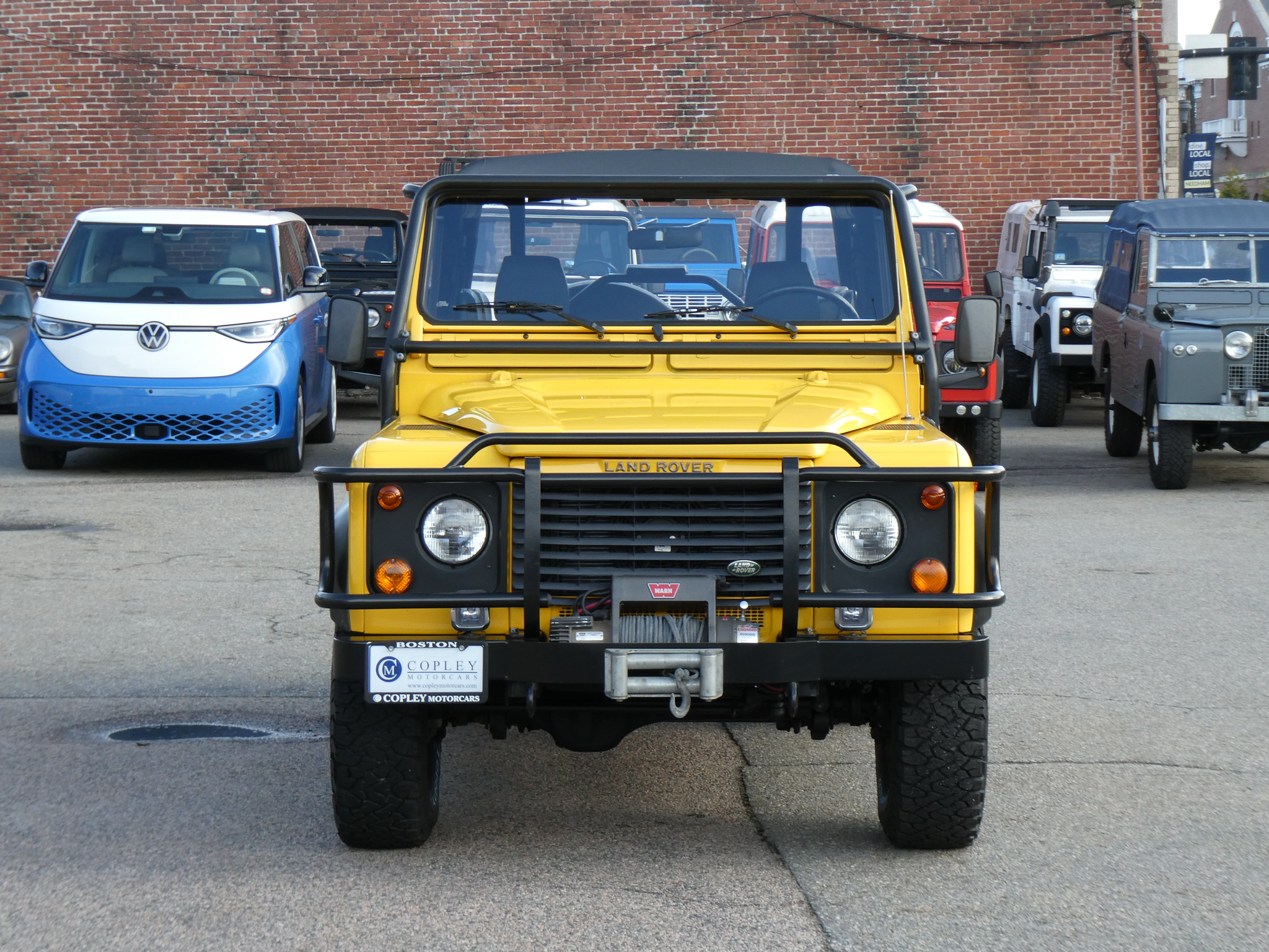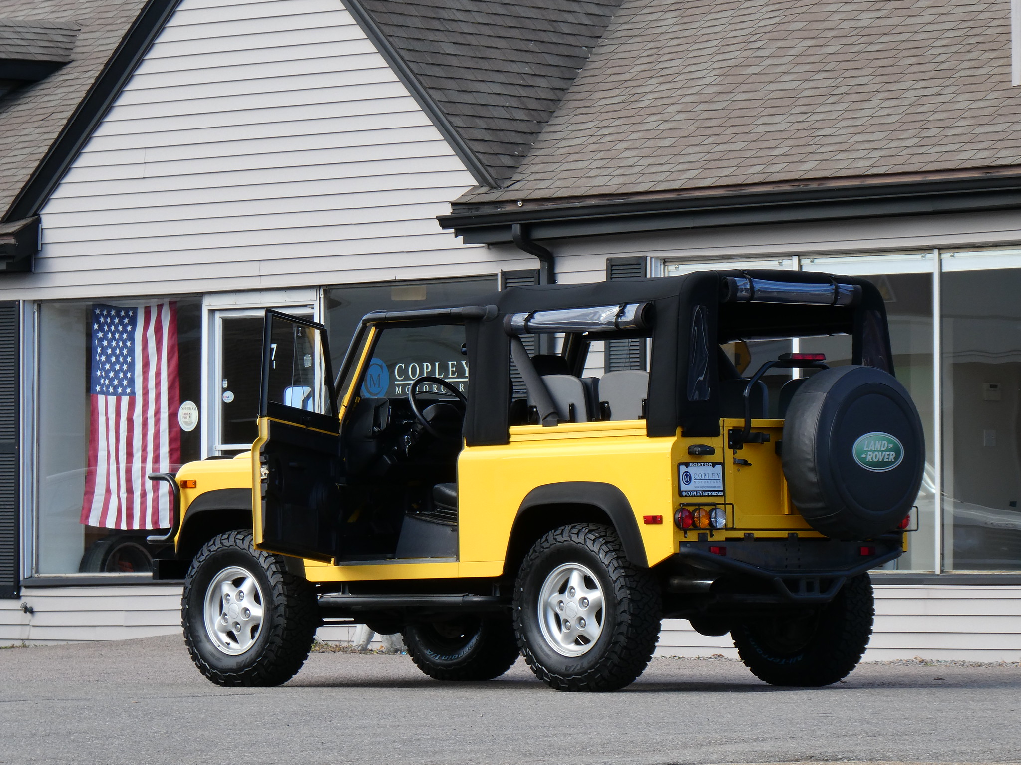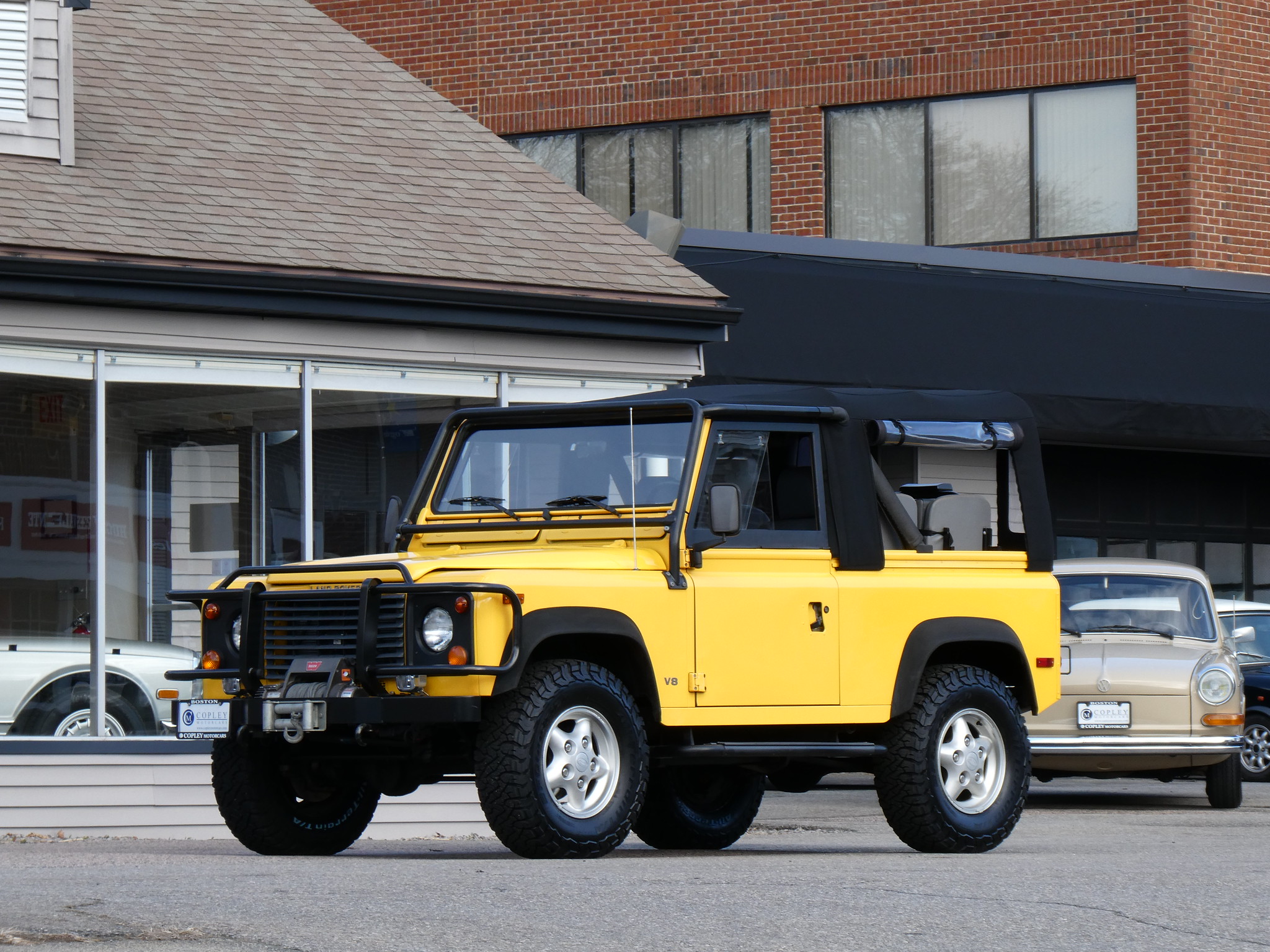 1997 Land Rover NAS Defender 90 soft top, S/N SALDV2246VA111502, AA Yellow with grey twill vinyl seat upholstery, full safari cage, full updated soft top with zip/roll-up windows, full time 4 wheel drive with high-low range, automatic transmission, air conditioning, Freestyle alloy wheels, front brush guard, front bumper integrated 9000lb Warn winch, side steps, rear lamp guards, 4 side facing rear seats with seat belts, delivered new June 30, 1997 via Land Rover Colorado Springs, complete with original owner’s manuals and spare keys, in the Copley family since 2009, an authentic North American Specification Defender 90, and one of just 371 in AA Yellow from the final year of import by Land Rover North America.